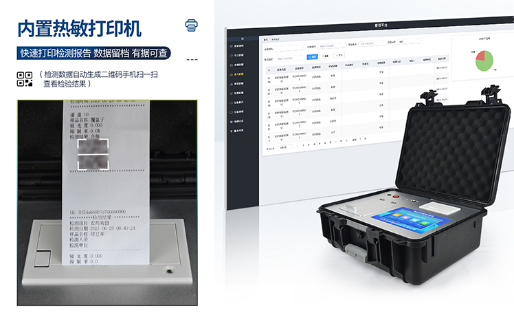 | 安卓智能操作系统,采用更加**和人性化操作,仪器具有无线联网上传功能,快速上传数据,进行数据统计和分析。 | 智能化程度高,仪器具有自检功能:具有开机自检和调零功能,具有自动检测重复性功能;同时,检测完成可自动打印检测报告和二维码。手机扫码可显示出详细检测信息。 | 仪器带有监管平台,数据可局域网和互联网数据上传,检测结果直接传至食品安全监管平台。进行区域食品安全监管及大数据分析处理与数据统计,检测区域食品安全长短期动态,达到食品安全问题预估、预警 。 | 样品处理简单省力,整体操作快速、安全、便捷。 | 仪器具有自身保护功能,可设置用户名及密码,防止非工作人员操作等。 | 内置强大的数据库,可在仪器上直接选择样品名称、检测指标、送检单位等信息,也可在仪器上直接编辑录入样品名称、检测指标、送检单位等信息并保存进样品数据库,方便后期操作调取使用。 | 仪器具有重新校准、锁定、恢复出厂设置功能。 |