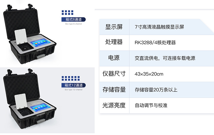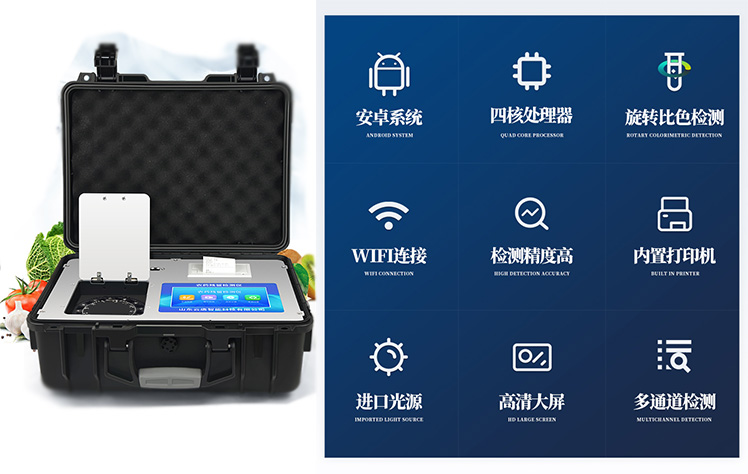 | 机器采用全新安卓智能系统,主控芯片采用 ARM Cortex-A7,RK3288/4核处理器,主频1.88Ghz,运转速度更快速,稳定性更强。 | 创新检测模式: *仪器采用精密旋转比色池设计,使用光源一致,可以解决各通道间由于光源误差带来的检测结果误差问题,检测结果更加精准。 *仪器具有自动识别比色皿检测功能,即:将样品比色皿放入仪器后,点击样品检测,仪器自动识别比色皿进行通道检测。 | 供电方式:交直流两用,直流 12V 供电,可连接车载电源,可配 6ah 大容量充电锂电池,方便户外流动测试。 | 显示方式:7英寸液晶触摸屏显示,人性化中文操作界面,读数直观、简单。 | 检测通道:8个检测通道,可以同时测试多个样品,循环检测,即放即检,每个样品由程序控制分别独立工作,不会互相干扰。 | 高精光源系统: ①仪器光源采用进口超高亮发光二极管,光源亮度可以自动调节与校准 ②智能恒流稳压,光强自动校准,长时间连续工作光源无温漂现象。 | 智能操作分析系统: ①仪器具有100多种蔬菜名称菜单库,分类管理,并可按需添加或删除、编辑蔬菜名称;可在同一检测界面自动对应相关检测通道一次性选择1-24个样品名称,无需退出界面,节省操作时间。 ②内置新国家限量标准,与所测结果进行现场比对,并持续更新标准。 | 完善的配套硬件: ①采用串口5v打印机,可选择手动打印或者自动打印,三分钟出打印结果,打印格式为检测人姓名、吸光度差值、检测时间、检测机构、样品名称及结果判定。 ②仪器具有无线上传模块,检测结果可批量打印,批量上传。 | 数据调用: ①仪器可存储20万条检测结果, ②检测结果为Excel表格,方便后期进行数据分析与汇总报告 ③仪器采用USB2.0接口设计,支持 U 盘存储,方便数据的存贮和移动,并可随时与计算机直接相连,实现数据查询、浏览、分析、统计、打印等。 | 后期产品固件可升级。 | 安全证书,放心保障:仪器具有中国计量科学研究院校准证书,权威认证,使用放心。 | 机箱采用工业级ABS工程塑料箱,方便携带,稳固耐用,便于流动测试。 |