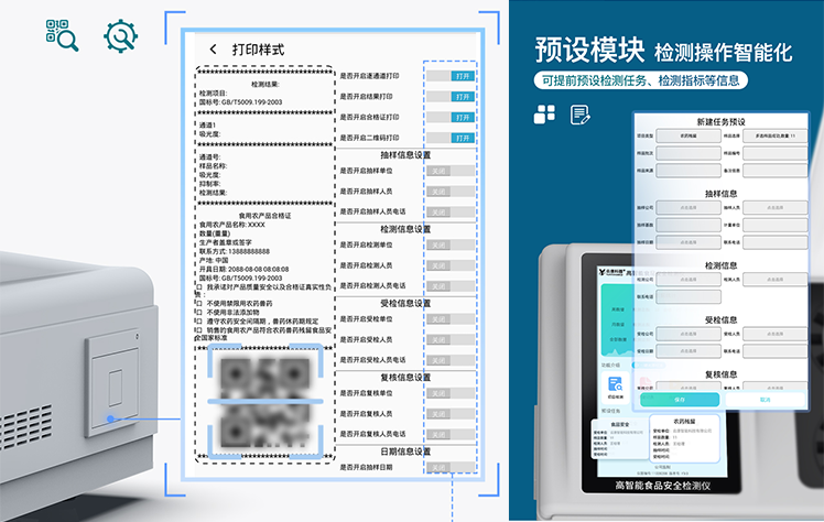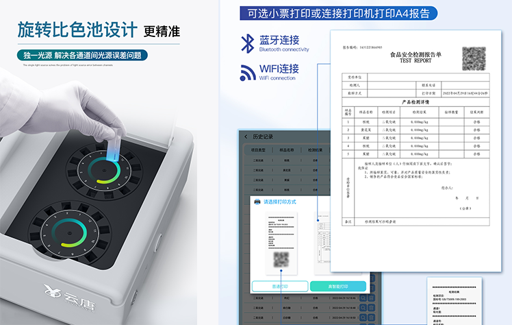 | 仪器采用台式一体化系统检测技术,将分光光度模块、胶体金检测模块、新型农残检测模块、数字化管理模块、无线通讯模块高度集成于一体,支持检测200种食品安全检测项目,同时预留升级检测方法。 | 仪器检测模块标准化、智能化,可随意自由组合。检测箱体内置多个标准检测单元,检测模块可以调整配置。 | 仪器采用全新安卓智能系统,主控芯片采用 ARM Cortex-A7,RK3288/4核处理器,10.1寸高清液晶触摸竖屏,更加**的UI交互界面,运转快捷;仪器配备无线通信模块: 4G(APN)通讯模块、Wifi模块,蓝牙传输,同时具有双USB接口以及RJ45接口能以多种方式实现数据保存和数据传输功能。 | 创新检测模式★检测通道:≥12通道;采用精密旋转比色池设计,使用同芯片同光源校准精度,解决不同光源之间的误差值。1-12通道间误差0.1%。(***:ZL202022821055.2) ★仪器具有自动识别比色皿检测功能,即:将样品比色皿放入仪器后,点击样品检测,仪器自动识别比色皿进行通道检测。 | 进口高精光源:高精度进口四波长冷光源,通道配置 410、520、590、630nm 波长光源,一个光源芯片驱动一个光源,误差极小,每台设备单独**校准光源,**比对,同时参照四种不同波段光源全方位覆盖市面上99%的农残食品项目检测。 | 胶体金模块检测方式:★采用COMS实时成像技术,可采集多个画面,支持2个金标同时读卡,通过不同颜色的灰度变化,一秒精准得出结果。 | 智能操作分析系统: | ★便捷操作系统:设备检测时可在同一检测界面自动对应相关检测通道一次性选择1-12个样品名称,无须退出界面,节省操作时间。(需提供对应证明) | ★数据集成系统:设备首页自动统计检测数据包含:周检测数据、月检测数据,全部检测总数量,均包含检测总数,合格数,不合格数,以及相关柱形分析图,对各项检测数据清晰掌握,无需电脑查询,更加快捷直观。(需提供对应证明文件) | ★项目预设系统:支持添加单个及多个相同或不相同的任务预设,一键快速调取,每一个任务分别可以设置不同的样品、批次、编号、来源、备注、抽样信息、检测信息、受检信息、复核信息等更多信息。无缝链接平台和APP实时查看下发任务。(需提供对应证明文件) | ★数据监管系统:同步对接监管平台,数据可局域网和互联网数据上传,检测结果可选择直接传至食品安全监管平台。集成OSS输出存储服务、区分设备定向管理应用,进行区域食品安全监管及大数据分析处理与数据统计,检测区域食品安全长短期动态,达到食品安全问题预估、预警。(需提供对应食品理化分析系统计算机软件著作权)。 | ★ 自定义打印系统:内置全新打印系统,新创自定义打印方式,可按需灵活设置开启或关闭:产品合格证(国家农业部标准要求),二维码,抽样信息、检测信息,受检信息、复核信息、抽样日期、检测日期等信息的打印。(需提供对应证明) | ★系统远程更新功能:可定向分客户分仪器更新系统,按照不同客户后期实际需求添加项目,无需机器返厂,即可远程实时升级全新系统,节省时间成本及避免运输造成设备损坏。 | 仪器主机采用一体化防水、抗压、防撞击、防腐蚀箱体设计,同时配备交直流供电,可连接车载电源,可选配大容量充电锂电池,满足现场野外检测需求。 | 安全证书,放心保障:仪器具有中国计量科学研究院校准证书,权威认证。 |