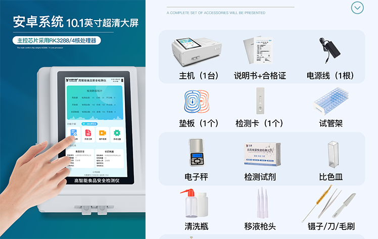 | 食品添加剂:二氧化硫、双氧水、亚硝酸盐、硝酸盐、苯甲酸钠、山梨酸钾、糖精钠、甜蜜素、木耳硫酸镁等 | 有毒有害物质:甲醛、吊白块、硼砂、过氧化苯甲酰、溴酸钾、罗丹明B、三聚氰胺、苏丹红、工业碱、尿素、明矾等 | 果蔬:农药残留(酶抑制率法) | 病害肉:组胺、挥发性盐基氮 | 重金属含量:铅、镉、铬、汞、砷、锡、镍、铝等 | 水产品安全类:孔雀石绿、氯霉素、呋喃妥因、呋喃西林、呋喃它酮、呋喃唑酮等 | 瘦肉精激素类(兽药):盐酸克伦特罗、沙丁胺醇、莱克多巴胺、己烯雌酚等 | 抗生素残留:四环素类、硝基呋喃类、磺胺类、β-兴奋剂类、沙星类、磺胺类、喹诺酮类,甲砜霉素,氟苯尼考,金刚烷胺、替米考星、庆大霉素、林可霉素、链霉素、恩诺沙星、环丙沙星、头孢啦啶、青霉素、阿莫西林等 | 真菌毒素类:食用油、粮食及饲料中黄曲霉毒素B1、黄曲霉毒素总量,奶中黄曲霉毒素M1、呕吐毒素、玉米赤霉烯酮、赭曲霉毒素A、T2毒素、伏马毒素等 | 水酒饮品分析:乳品及牛奶中蛋白质;酒中甲醇、乙醇、杂醇油;蜂蜜中果糖和葡萄糖、蔗糖、淀粉酶、酸度;水中氰化物、余氯,饮料中维C等 | 调味品成分: 食醋的总酸、酱油的总酸、芝麻油纯度、谷氨酸钠、酱油氨基酸态氮、食盐中亚铁氰化钾、食盐中碘等 | 食用色素类:红色色素(胭脂红、苋菜红、苋菜红)、黄色色素(柠檬黄、日落黄)、蓝色色素(亮蓝)等 | 动物疫病类:禽流感、新城疫、牛羊口蹄疫、牛羊结核病、牛羊包虫、牛羊布病、小反刍兽、猪蓝耳病毒、猪瘟病毒、猪伪狂犬病毒、猪细小、猪圆环、犬细小病毒、犬瘟热病毒、犬狂犬病毒等 | 蜂蜜成分:果糖和葡萄糖、蔗糖、淀粉酶、酸度等 | 水产品安全类:孔雀石绿、氯霉素、呋喃妥因、呋喃西林、呋喃它酮、呋喃唑酮等 | 食用油脂:过氧化值、酸价等 | 蛋类药物残留:氯霉素,四环素,磺胺类,喹诺酮类,呋喃西林,呋喃它酮,呋喃妥因,呋喃唑酮,氟苯尼考,阿莫西林、头孢氨苄、红霉素、链霉素等 |