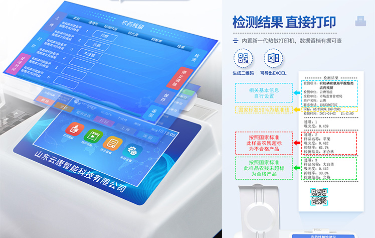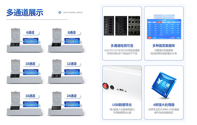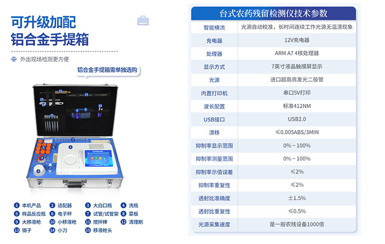 | 乙酰胆碱酯酶和丁酰胆碱酯酶试剂均可以使用,符合****和农业部标准的要求。 | 自动判断样品是否合格,检测结果更加直观。 | 仪器具有100多种蔬菜名称菜单库,分类管理,并可按需添加或删除蔬菜名,编辑蔬菜名称,可直接打印出蔬菜名称。 | 检测通道:6个检测通道,可以同时测试多个样品,循环检测,即放即检,每个样品由程序控制分别独立工作,不会互相干扰。 | 智能操作系统,采用更加人性化操作,主控采用多核处理器,主频1.88Ghz,运转速度更快速,稳定性更强。 | 显示方式:7英寸高灵敏真彩触摸屏显示,人性化中文操作界面,读数直观、简单。 | 打印机采用串口5v打印,可选择手动打印或者自动打印,三分钟出打印结果,打印格式为检测人姓名、吸光度差值、检测时间、检测机构、样品名称及结果判定。 | 光源采用进口超高亮发光二极管,具有低功耗、高精度、稳定性强、光源可控可以关掉不使用的光源,响应速度快等优点。 | 智能恒流稳压,光强自动校准,长时间连续工作光源无温漂现象。 | 仪器具有GPRS远传功能,可插手机卡实现数据远传平台,wifi联网功能,可将数据快速上传电脑,进行数据管理与统计。 | 采用USB2.0接口设计,方便数据的存贮和移动,并可随时与计算机直接相连,并且可用计算机控制仪器。实现数据查询、浏览、分析、统计、打印等。 | 智能化程度高,仪器具有自检功能,具有开机自检和调零功能,具有自动检测重复性功能 | 仪器具有自身保护功能,可设置用户名及密码,防止非工作人员操作等。 | 采用DC12v直流供电,安全系统更高,并且配备6A锂电池充电器。 | 仪器具有重新校准、锁定、恢复出厂设置功能。 |