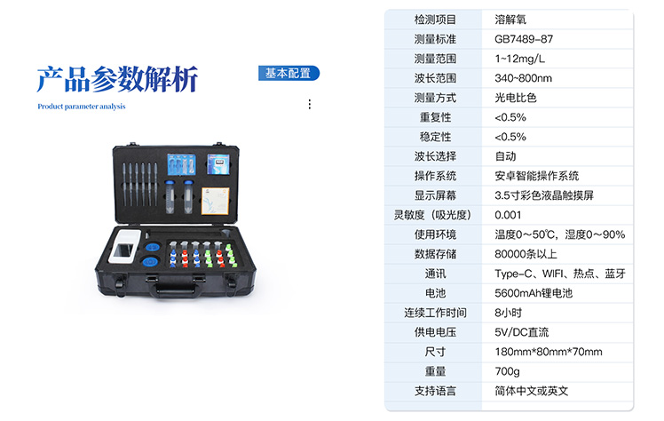 | 检测方法:光电比色 | 测试模式:浓度 | 波长范围:340~800nm | 系统:安卓智能操作系统 | 波长选择:自动 | 显示屏幕:3.5寸彩色液晶屏 | 稳定性:<0.5% | 灵 敏 度(吸光度):0.001 | 使用环境:0~50℃ 0~90%的相对湿度 | 数据存储:80000条以上 | 通讯:Type-C、WIFI、蓝牙 | 电池:5600mAh锂电池 | 连续工作时间:12小时 | 供电电压:5V/DC直流 | 尺寸:18cm*8cm | 重量:700g | 支持语言:简体中文或英文 |