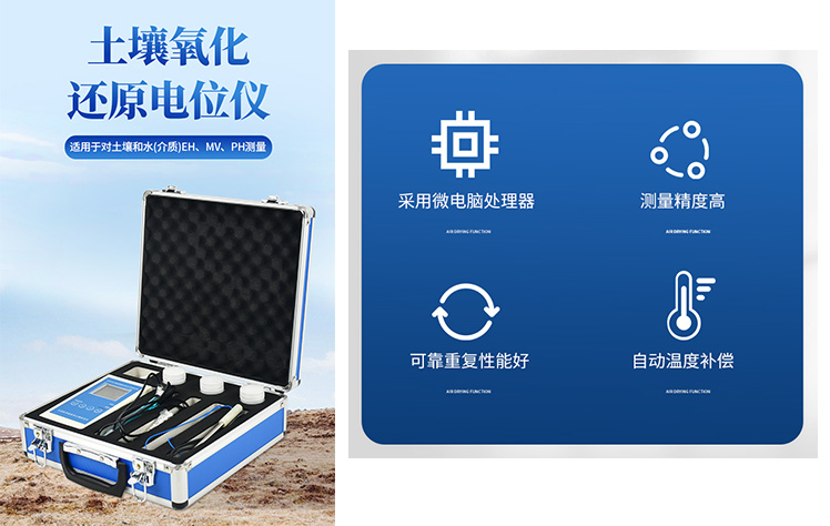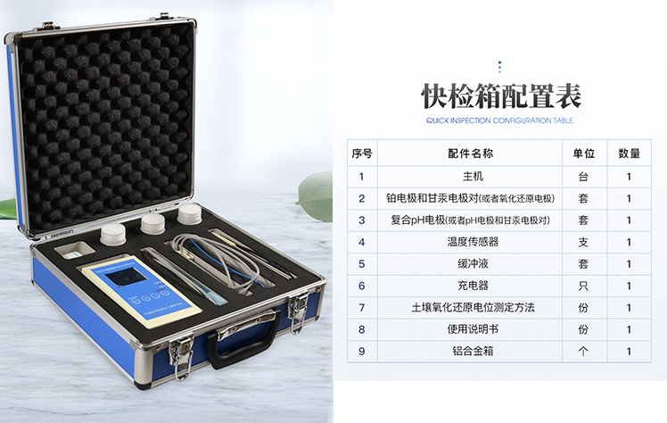 | 主机 1 台 | 铂电极和甘汞电极对(或者氧化还原电极) 1 套 | 复合pH电极(或者pH电极和甘汞电极对) 1 套 | 温度传感器 1 支 | 缓冲液 1 套 | 充电器 1 只 | 土壤氧化还原电位测定方法 1 份 | 使用说明书 1 份 | 铝合金箱 1 个 |