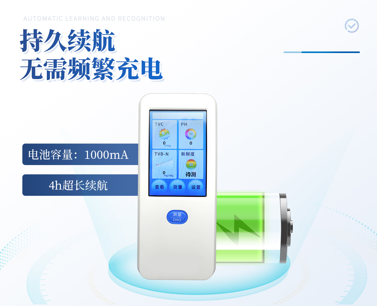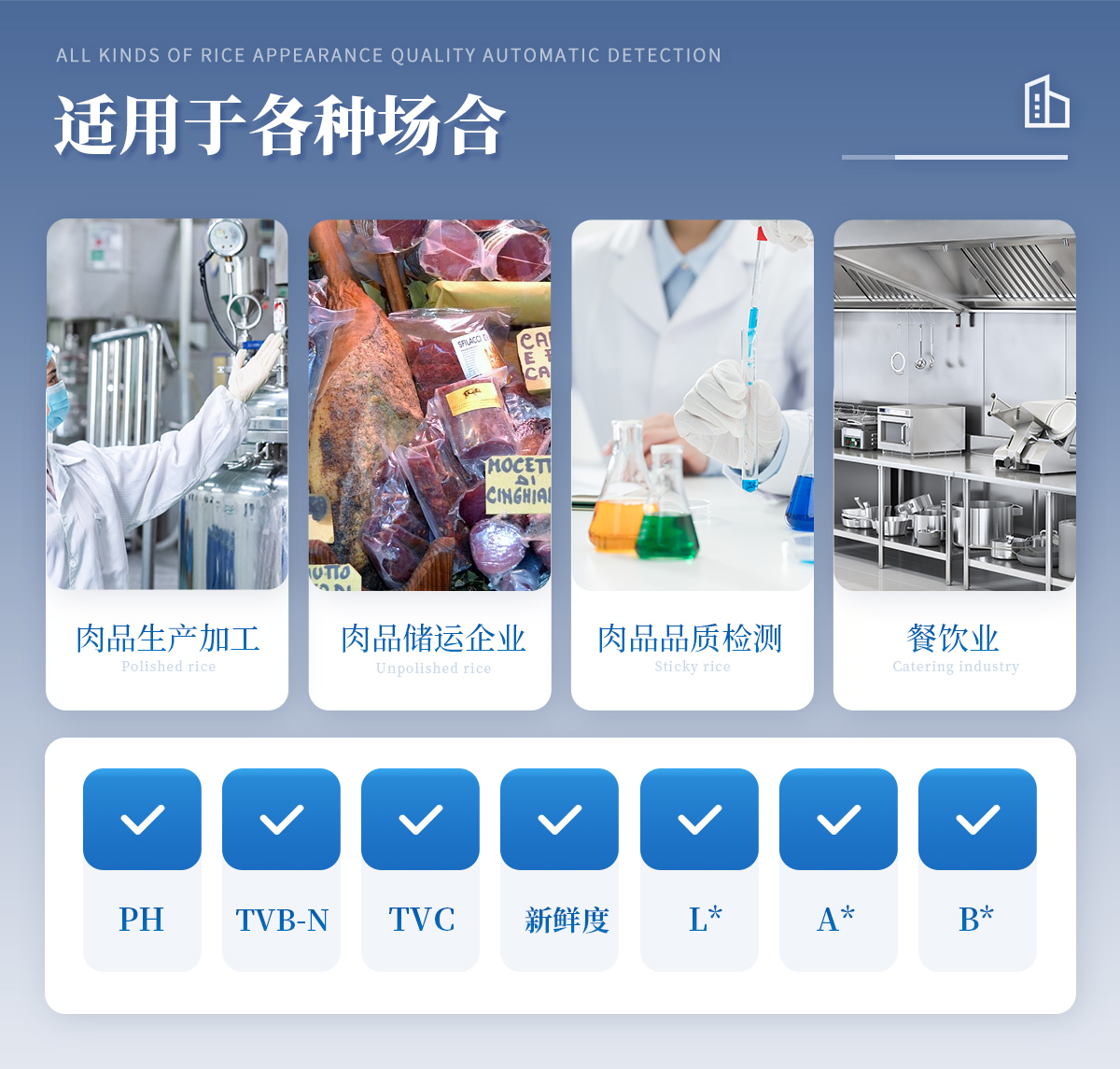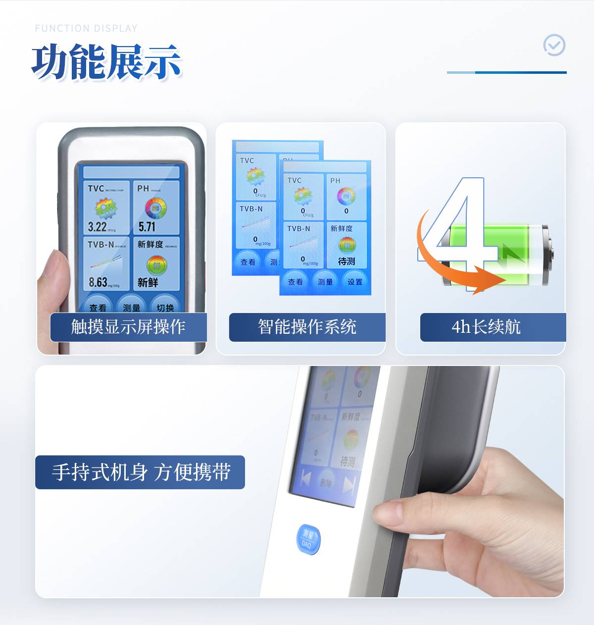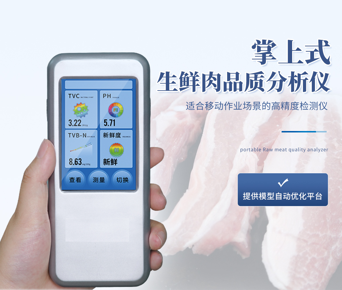 联合中国农业大学彭彦昆教授团队研发的掌上式生鲜肉新鲜度分析仪,可用于检测生鲜肉的TVC、pH、TVB-N、新鲜度、L*、A*、B*等评价指标。Palmarter具有体积小、便 于携带、性价比高等特点,其应用场景包括但不限于肉储运企业、肉品品质监管部门、饭店、超市、菜场、家庭等。