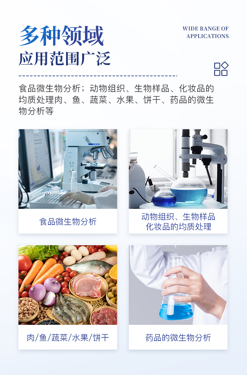应用领域:食品微生物分析;动物组织、生物样品、化妆品的均质处理;肉、鱼、蔬菜、水果、饼干;药品的微生物分析等;