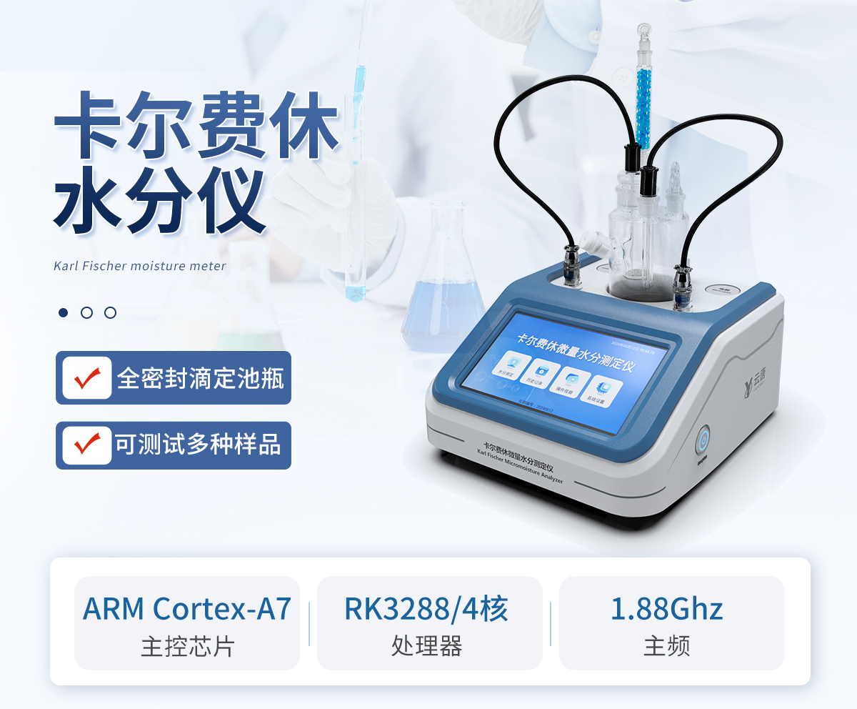 1.仪器主控芯片采用ARM Cortex-A7,RK3288/4核处理器,主频1.88Ghz,运转速度更快速,稳定性更强。 2.显示方式:7英寸液晶触摸屏显示,人性化中文操作界面,读数直观、简单。 3.仪器采用全密封滴定池瓶,避免试剂与人接触,杜绝环境湿度对检测的影响;检测过程中仪器自动控制,搅拌、测定60秒左右完成,可直接显示测定结果,无需人员频繁操作。 4.仪器内置操作视频,可直接观看学习操作方法。 5.仪器可以测试多种样品,循环检测,即放即检。 6.仪器可对样品信息自由编辑,包括:样品名称、样品编号、检测单位、检测人员、联系方式、受检单位等。 7.仪器可对检测样品测定信息进行设置,例如:电解电流、电解电压、微量水分含量、测定时间、百分含量、进样体积、试样密度、毛重和皮重等。 8.水分检测方式可根据实际需求选择体积法或重量法。 9.内置热敏打印机,可直接打印检测结果,并可根据需求灵活设置打印内容(二维码,样品编号、检测单位、检测人员、联系电话、受检单位、检测日期等)。 10.样品检测结果可通过二维码扫码查看。 11.检测数据可通过历史记录进行检索,通过设置检测日期、样品编号、检测单位、检测人员、样品名称、受检单位等信息查找对应数据。 12.仪器配备标准USB接口,免驱动安装。检测结果存储容量20万条以上,可生成Excel表格进行拷贝。 13.仪器配备WiFi通信模块,可上传数据至云平台,实现电脑端数据查询、浏览、分析、统计等。 14.仪器可定向远程更新,进行升级维护,无需返厂更新,节省时间及人力成本,避免了物流运输导致设备损坏的潜在风险。