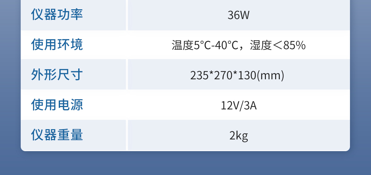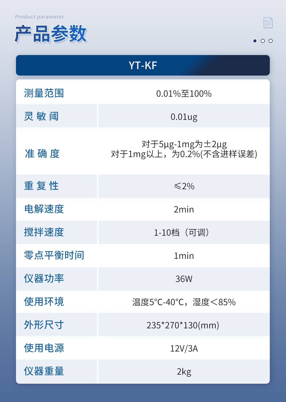 1.测量范围:0.01%至100% 2.灵 敏 阈:0.01ug 3.准 确 度:对于5μg-1mg为±2μg,对于1mg以上,为0.2%(不含进样误差) 4.重 复 性:≤2% 5.电解速度:2min 6.搅拌速度:1-10档(可调) 7.零点平衡时间:1min 8.仪器功率:36W 9.使用环境:温度5℃-40℃,湿度<85% 10.外形尺寸:235*270*130(mm) 11.使用电源:12V/3A 12.仪器重量:2kg