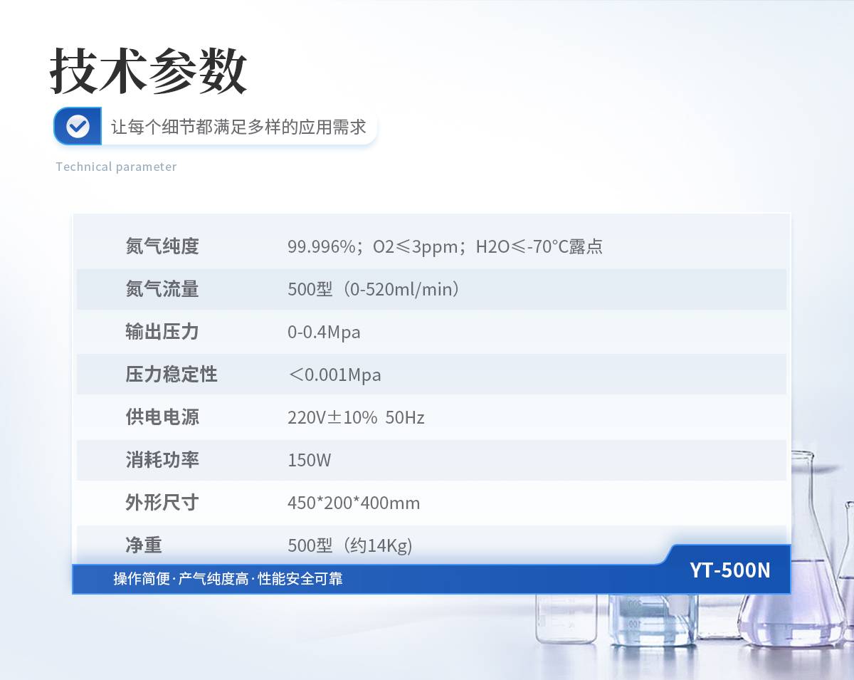 1、氮气纯度: 99.996%;O2≤3ppm;H2O≤-70℃露点 2、氮气流量: 0-320ml/min 3、输出压力: 0-0.4Mpa 4、压力稳定性:<0.001Mpa 5、供电电源: 220V±10% 50Hz 6、消耗功率: 120W 7、外形尺寸: 450*200*400mm 8、净重: 300型(约14Kg)