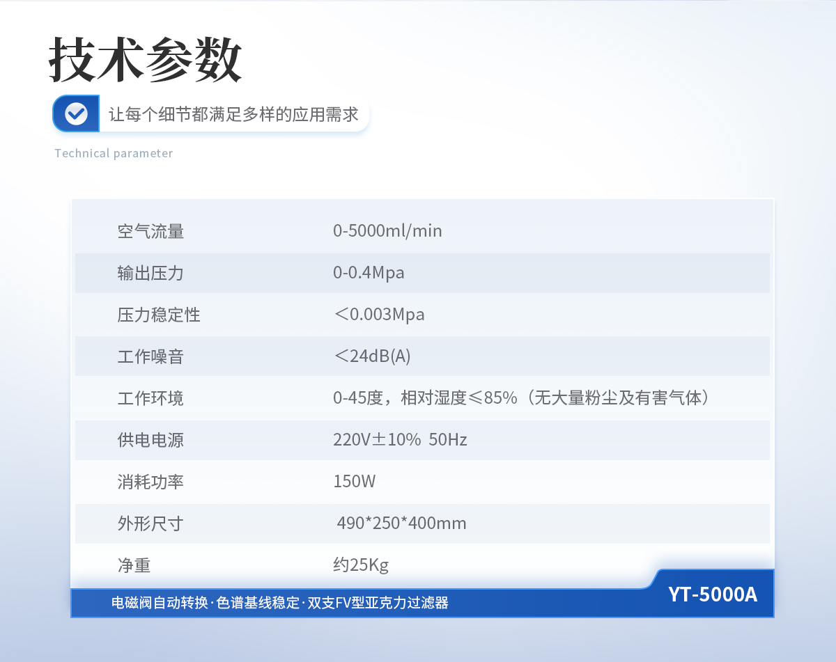 1、空气流量: 0-5000ml/min 2、输出压力: 0-0.4Mpa 3、压力稳定性:<0.003Mpa 4、工作噪音: <24dB(A) 5、工作环境: 0-45度,相对湿度≤85%(无大量粉尘及有害气体) 6、供电电源: 220V±10% 50Hz 7、消耗功率: 150W 8、外形尺寸: 490*250*400mm 9、净重: 约25Kg