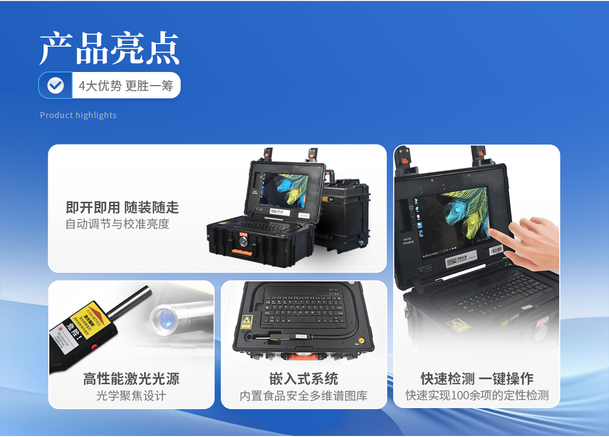 更专业 785nm光源:有效抑制荧光,适合便携式移动应用 超宽的光谱范围:检测物质种类更多 更高的信噪比:超强的微小信号探测能力 优质激光光源:数字可调高功率输出,窄线宽保障谱图质量 更便捷 光学聚焦设计:可以隔着塑料袋、玻璃瓶直接检测 快速自稳定光源:机器启动无预热时间,即开即用 超快检测速度:一秒出结果 便携式设计:独立可充电电源供电,随装随走,适合各种现场快检 更贴合应用 在线谱图库:提供各行业应用多维谱图库,支持在线升级 专业分析算法:智能解谱,自动匹配,多组分分析 行业应用软件:提供针对行业专用软件,支持客户订制