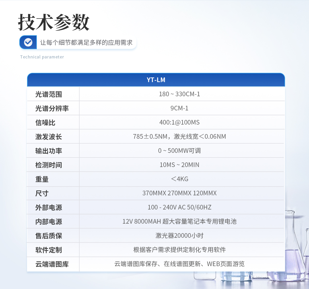 规格:YT-LM标准版 光谱范围:180 ~ 3300cm-1 光谱分辨率:9cm-1 信噪比:400:1@100ms 激发波长:785+0.5nm,激光线宽< 0.06 nm 输出功率:0~ 500mW可调 检测时间:10ms ~ 20min 重量:<4kg 尺寸:370mmx 270mmx 120mm 外部电源:100-240V AC 50/60Hz 内部电源:12V 8000mAH 超大容量笔记本专用锂电池 售后质保:激光器20000小时 软件定制:根据客户需求提供定制化专用软件 云端谱图库:支持云端谱图保存、 在线谱图更新、WEB 页面浏览