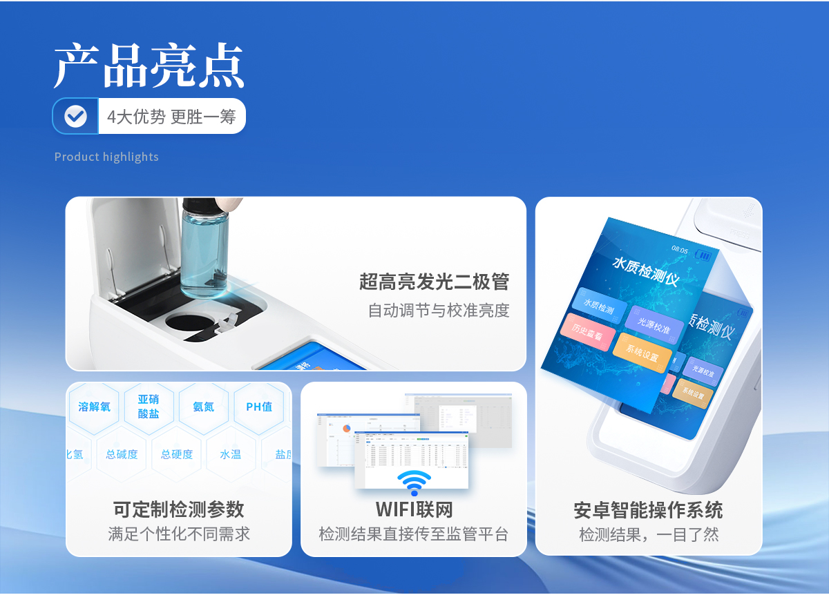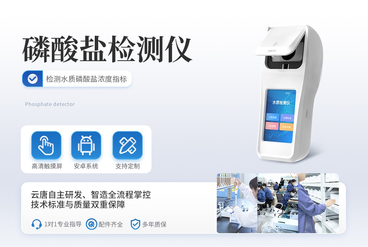 快速检测水体中磷酸盐指标 安卓智能系统操作更佳简便快捷 内置操作流程、操作简单、无需培训、直接上手 检测速度快,现场读取数据 便携式体积小,重量轻,方便户外检测 外形小巧美观,工作稳定免维护,具有较好的性价比 采用进口冷光源,光学性能稳定,寿命长达10万小时