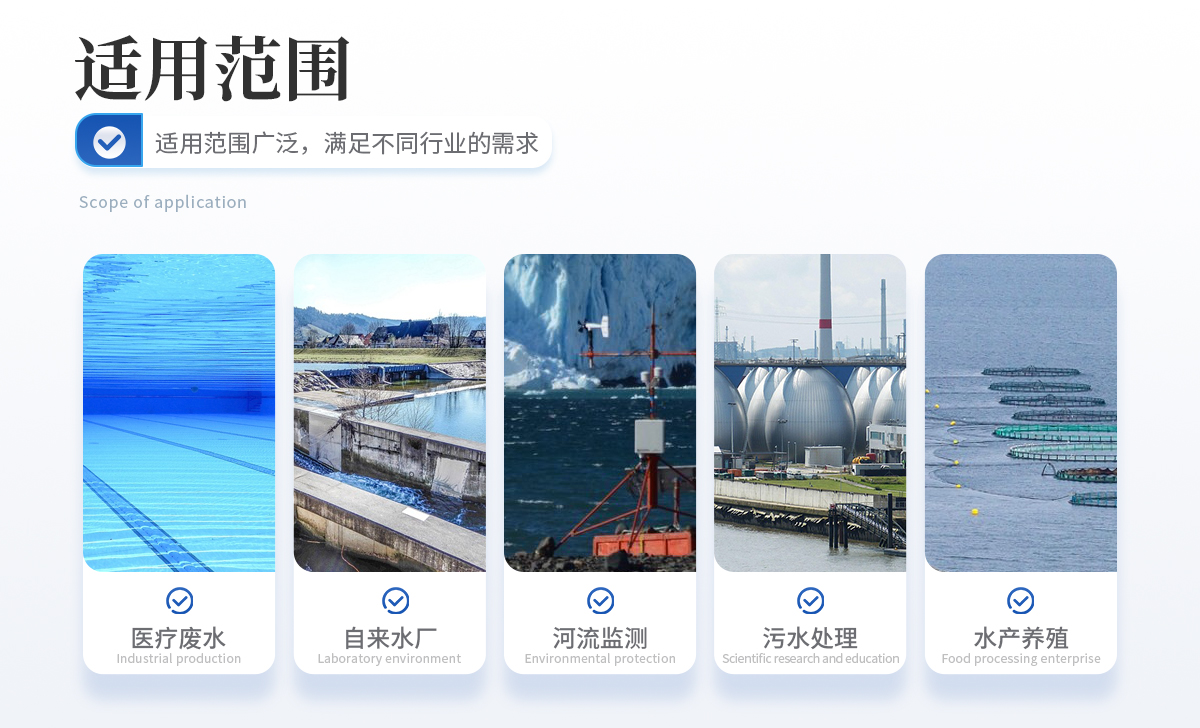 适用于纯净水厂、自来水厂、生活污水处理厂、工业污水、水产养殖、河流监测、游泳场馆、水源保护、生产监测、科研实验等。