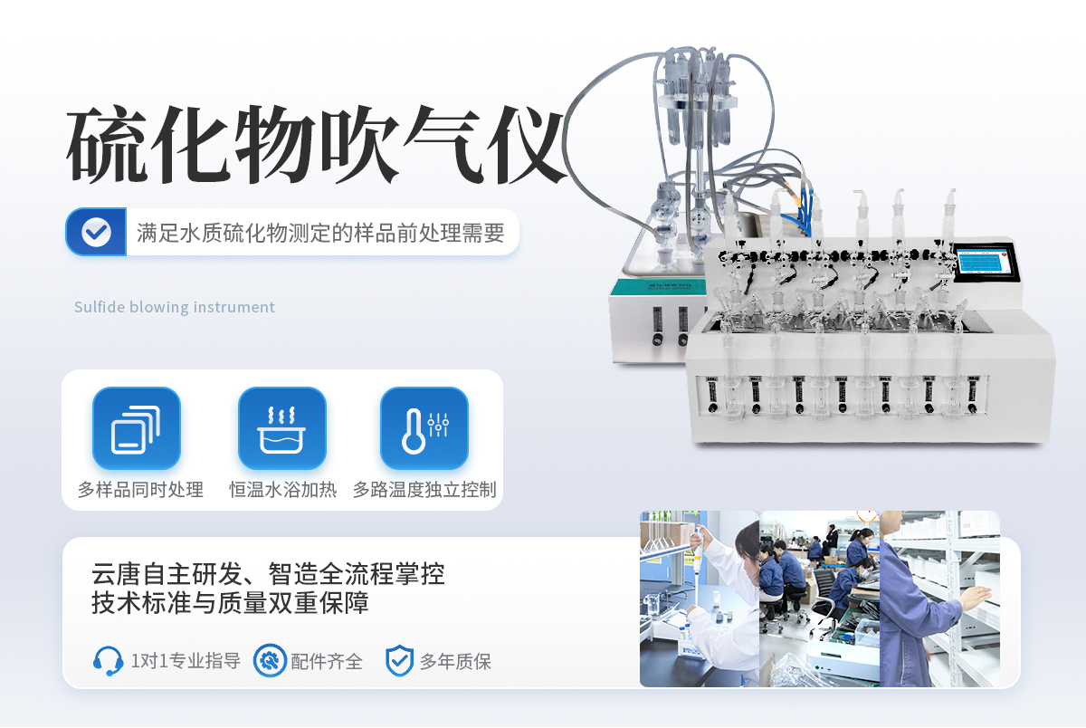 水样中的硫化物经酸化,生成的硫化氢随载气(氮气)进入吸收瓶/吸收显色管中被吸收溶液(乙酸锌-乙酸钠溶液或2%氢氧化钠溶液)吸收,选择相应的分析方法对吸收瓶/吸收显色管中吸收的硫离子进行分析测定。水质硫化物酸化吹气仪根据2022年新国标水质硫化物的测定-亚甲基蓝分光光度法(典量法)标准开发生产的。水质硫化物测定的样品前处理需要。