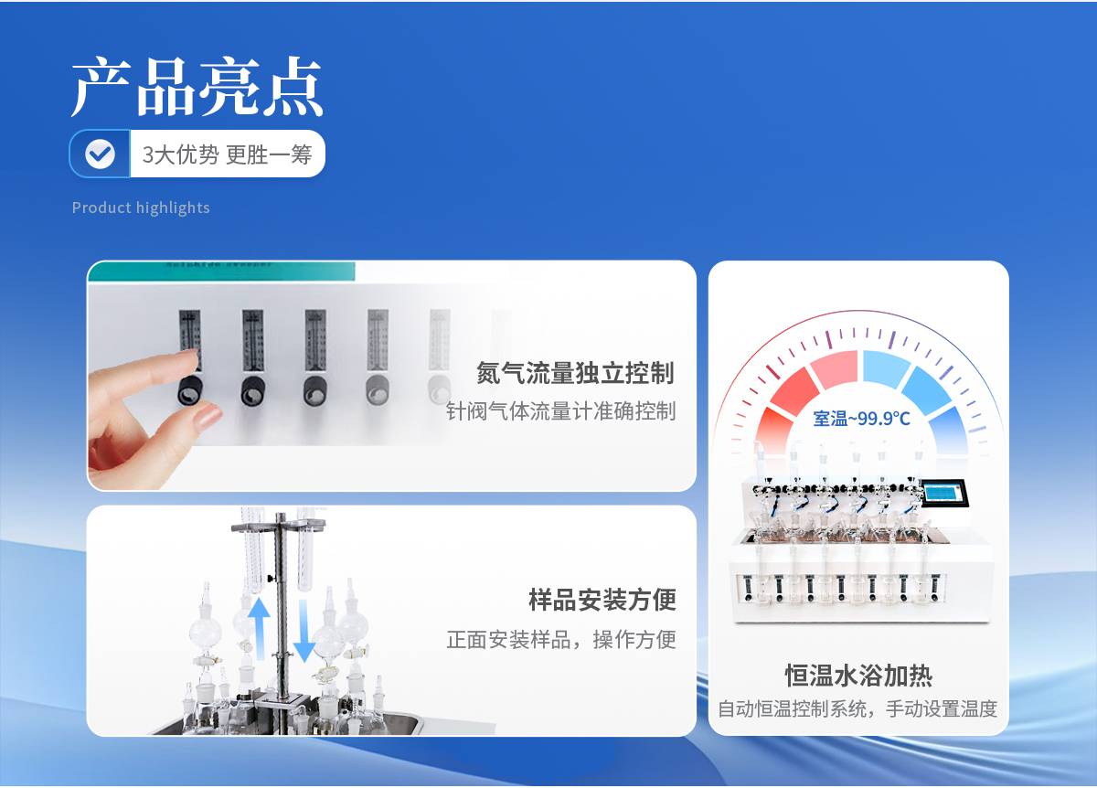 1.大容量反应瓶,可同时处理多个样品。 2.恒温水浴加热,具有快速自动恒温控制系统,加热温度可以手动设定。 3.每个样品的氮气流量独立控制调节或关闭,针阀气体流量计准确控制和显示气体总消耗量。 4.由升降位置固定旋钮调节样品架及配气系统,旋转样品架的升降,正面安装样品,操作方便。 5.盐酸口、气体进气口、出口三口一体且相互区分开,不干扰操作。