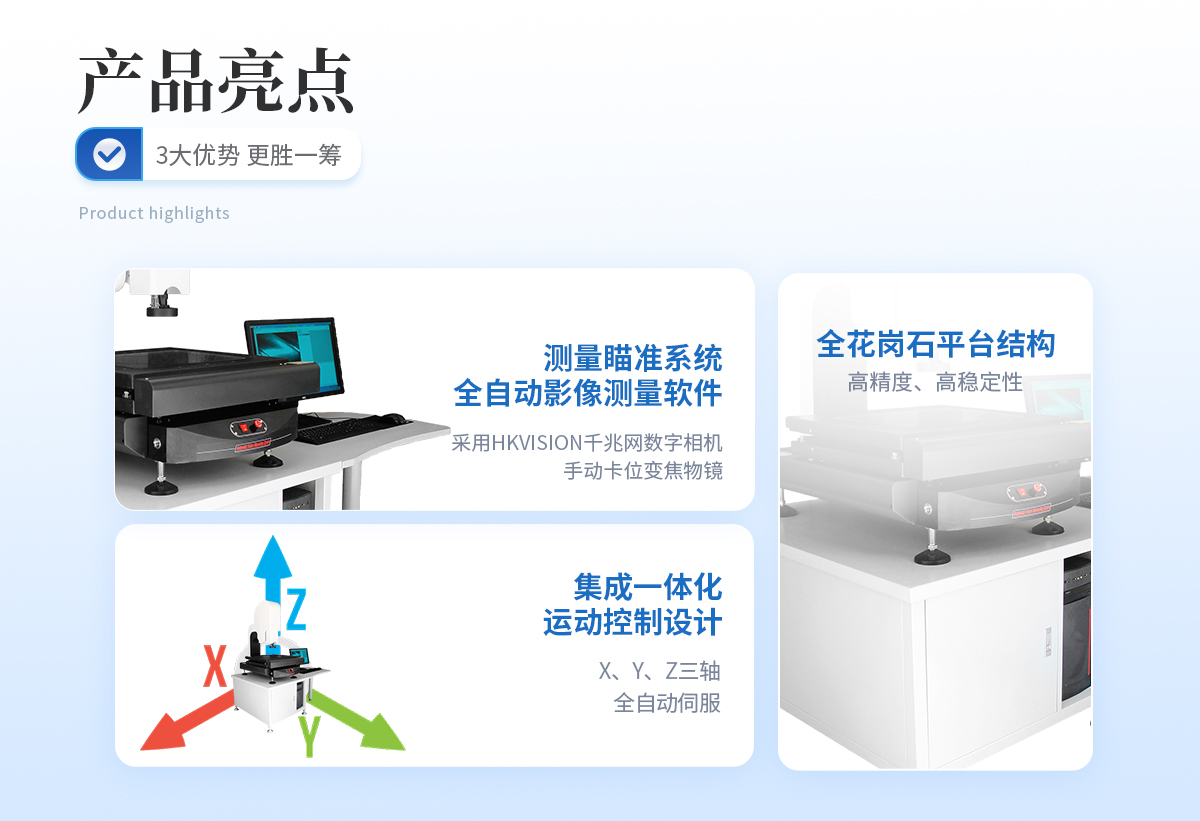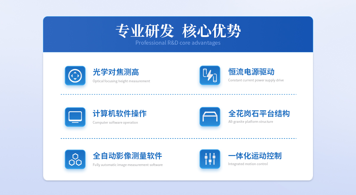| 1. 本机专为**全自动量测市场量身定制,其具有的CNC编程、精准定位、重复测量、SPC报表统计、自动测量结果输出等功能,能快速**地解决不同产品的批量测量需要,适用于以二维及简易三维测量为目的的一切应用领域, 广泛应用在锅炉、压力容器、航天、航空、电力、石油、化工、海洋石油、管道、军工、船舶制造、汽车、机械制造、冶金、金属加工业、钢结构、铁路交通、核能电力、高校等行业; | 2. 本机X、Y、Z三轴均为伺服驱动,由鼠标、键盘或选配摇杆操纵,通过本司专用的全自动影像测量软件,具有自动边缘提取、自动理匹、自动对焦、测量合成、影像合成等人工智能技术,同时,基于机器视觉与微米**控制下的自动对焦功能,可以满足清晰摄影下辅助测高需要(亦可加入精密测头完成接触式坐标测高)。可在使用夹具或工件随意放置的情况下,进行批量测量、SPC结果分类、自动输出测量结果等操作。 |