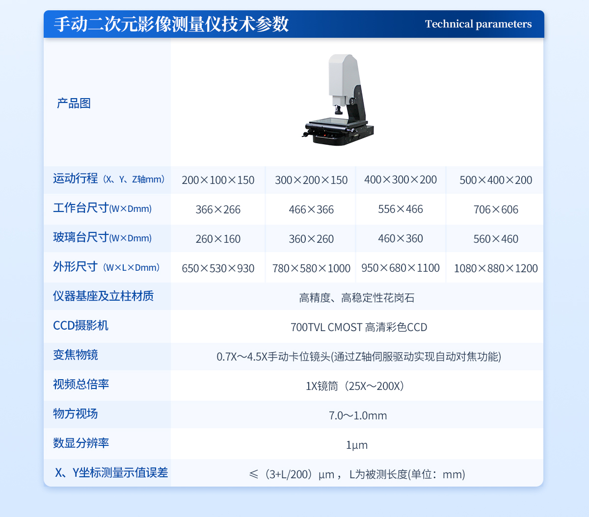 | 1. 运动行程(X、Y、Z轴mm):500×400×200 | 2. 工作距离:90mm | 3. 工作台呎寸(W×Dmm):740×620 | 4. 玻璃台呎寸(W×Dmm):560×460 | 5. 外形尺寸(W×L×Dmm):1100×850×1200 | 6. 仪器基座及立柱材质:高精度、高稳定性花岗石 | 7. CCD摄影机:HKVISION 160W网口相机 | 8. 变焦物镜: 0.7X~4.5X手动卡位镜头(通过Z轴伺服驱动实现自动对焦功能) | 9. 视频总倍率: 1X镜筒(25X~200X) | 10. 物方视场: 7.0~1.0mm | 11. 数显分辨率:1µm | 12. X、Y坐标测量示值误差≤(3+L/200)µm , L为被测长度(单位:mm) | 13. 操作方式:XYZ三轴全自动伺服电机控制 +集成一体化运动控制设计 (只需对接220V电源界面、USB界面、AV视频界面即可使用) | 14. 测量软件:INS全自动影像仪专用测量软件 | 15. 工作环境:温度20±5 ℃,湿度35%-75%(尽量满足环境条件),如果温湿度条件不能达到以上标准,至少要将仪器放置在少灰尘,少油气,远离振动源的室内。 |