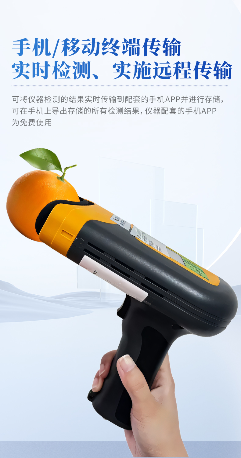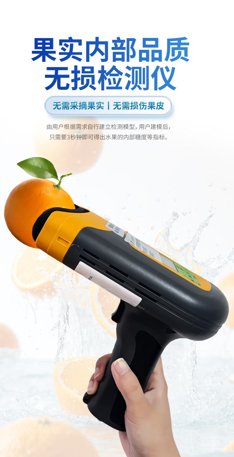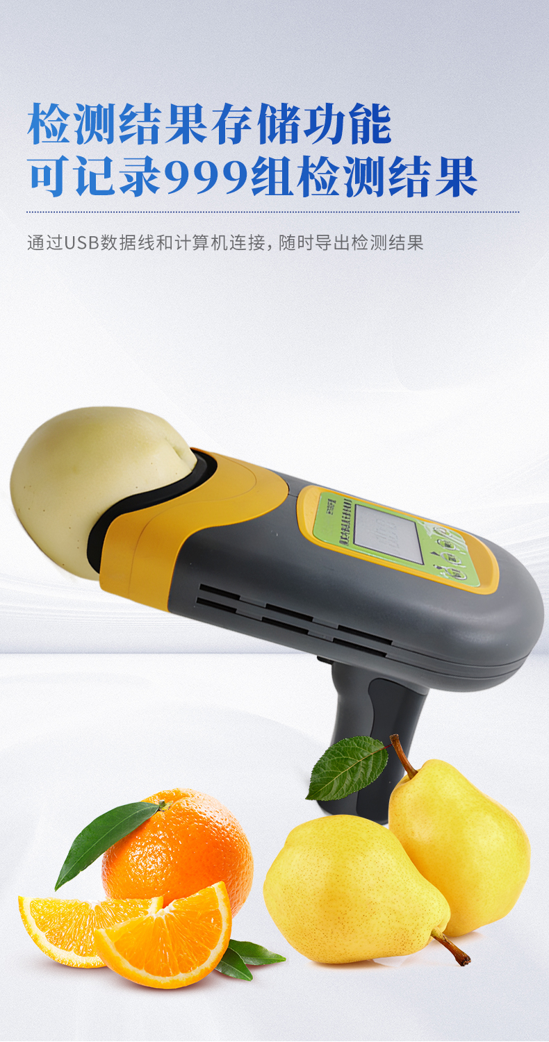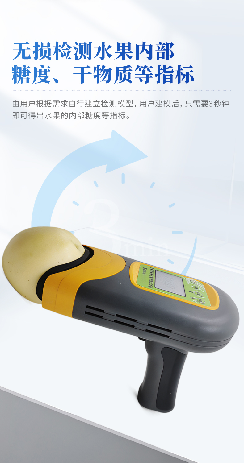 果实内部品质无损检测仪是一款便携式的果实质量检测仪,可以方便的检测水果内部的糖度、干物质等指标,由用户根据需求自行建立检测模型,用户建模后,只需要3秒钟即可得出水果的内部糖度等指标。仪器内置可充电锂电池,单次充满后可连续检测2000次,检测结果实时显示在设备屏幕上,用户可以通过数据线将检测数据上传到电脑中。