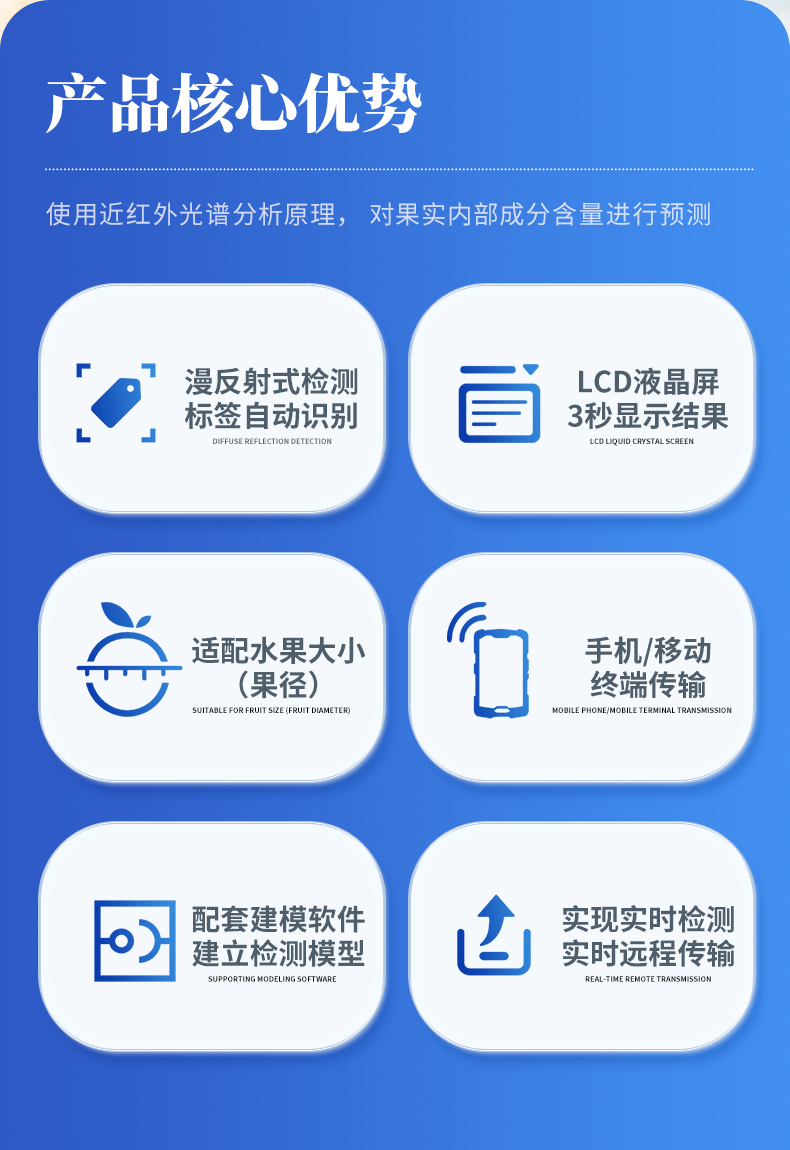 果实内部品质无损检测仪,使用近红外光谱分析原理, 对果实内部成分含 量进行预测。仪器由近红外光谱仪、光源、处理器、显示屏等组成。仪器光源发出近红外光,使果实内部的分子振动并发生能级跃迁,进而产生近红外光谱,因为近红外光谱和果实品质方面的成分含量具有相关性(如糖度、干物质等),可通过数学算法建立相关品质信息的预测模型,因此,在预测未知的水果样品时,只需要使用无损检测仪去扫描它,获取它的光谱信息,即可通过模型提供该水果样品的品质预测结果。