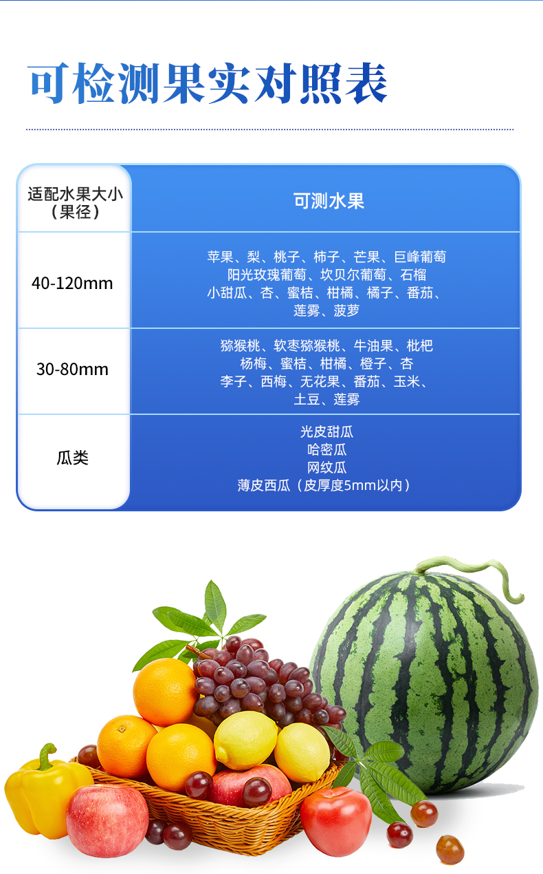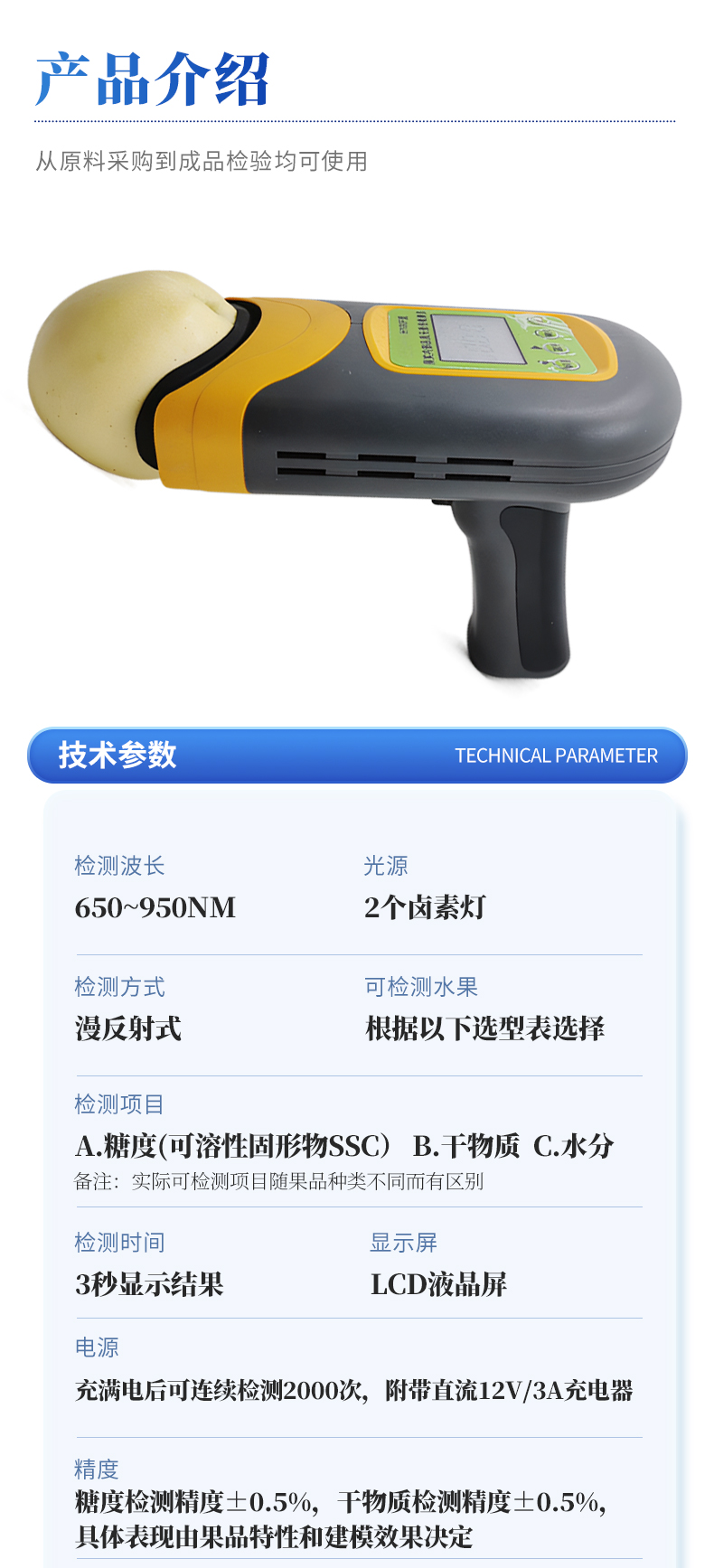 | 1.检测波长:650~950nm; | 2.光源:2个卤素灯; | 3.检测方式:漫反射式; | 4.可检测水果:根据以下选型表选择 | 5.适配水果大小(果径):H100F型(40-120mm),H100C型(30-80mm),H100M型(瓜类) | 6.检测项目: a.糖度(可溶性固形物SSC) b.干物质 c.水分 备注:实际可检测项目随果品种类不同而有区别 | 7.检测时间:3秒显示结果; | 8.电源:充满电后可连续检测2000次,附带直流12V/3A充电器; | 9.精度:糖度检测精度±0.5%,干物质检测精度±0.5%,具体表现由果品特性和建模效果决定; | 10.检测结果校正:带有检测值补偿功能,可直接在仪器或软件上脑操作调整;同时支持模型修正,可在配套设置软件上直接操作; | 11.模型存储:仪器可同时存储多套检测模型,检测模型的名称与存储顺序可由用户通过配套软件为仪器设定; | 12.数据传输:支持USB数据线传输,内置蓝牙模块支持无线传输; | 13.手机/移动终端传输功能:可将仪器检测的结果实时传输到配套的手机APP并进行存储,可在手机上导出存储的所有检测结果,仪器配套的手机APP为免费使用; | 14.提供传输协议,可供用户进行二次开发,实现实时检测、实施远程传输数据的功能; | 15.标签自动识别功能:内置RFID模块,可自动识别带有果树编号的标签卡; | 16.支持光谱信息存储和导出; | 17.配套建模软件:配备免费建模软件,可由用户自行建立检测模型,也可由用户导出原始光谱文件后自行建模;仪器也可导出光谱源文件,由用户自主使用其他软件建模; | 18.检测结果存储功能:仪器内部可记录999组检测结果,并可通过USB数据线和计算机连接,随时导出检测结果; | 19.操作环境:5~30℃,85%RH环境内使用 | 20.显示屏:LCD液晶屏 | 21.电池信息:2000mA可充电锂电池 | 22.尺寸:110×160×169mm,400g,ABS材质 | 23.附件:橡胶遮光罩,充电器,USB数据线,便携箱,软件(免费电子版) |