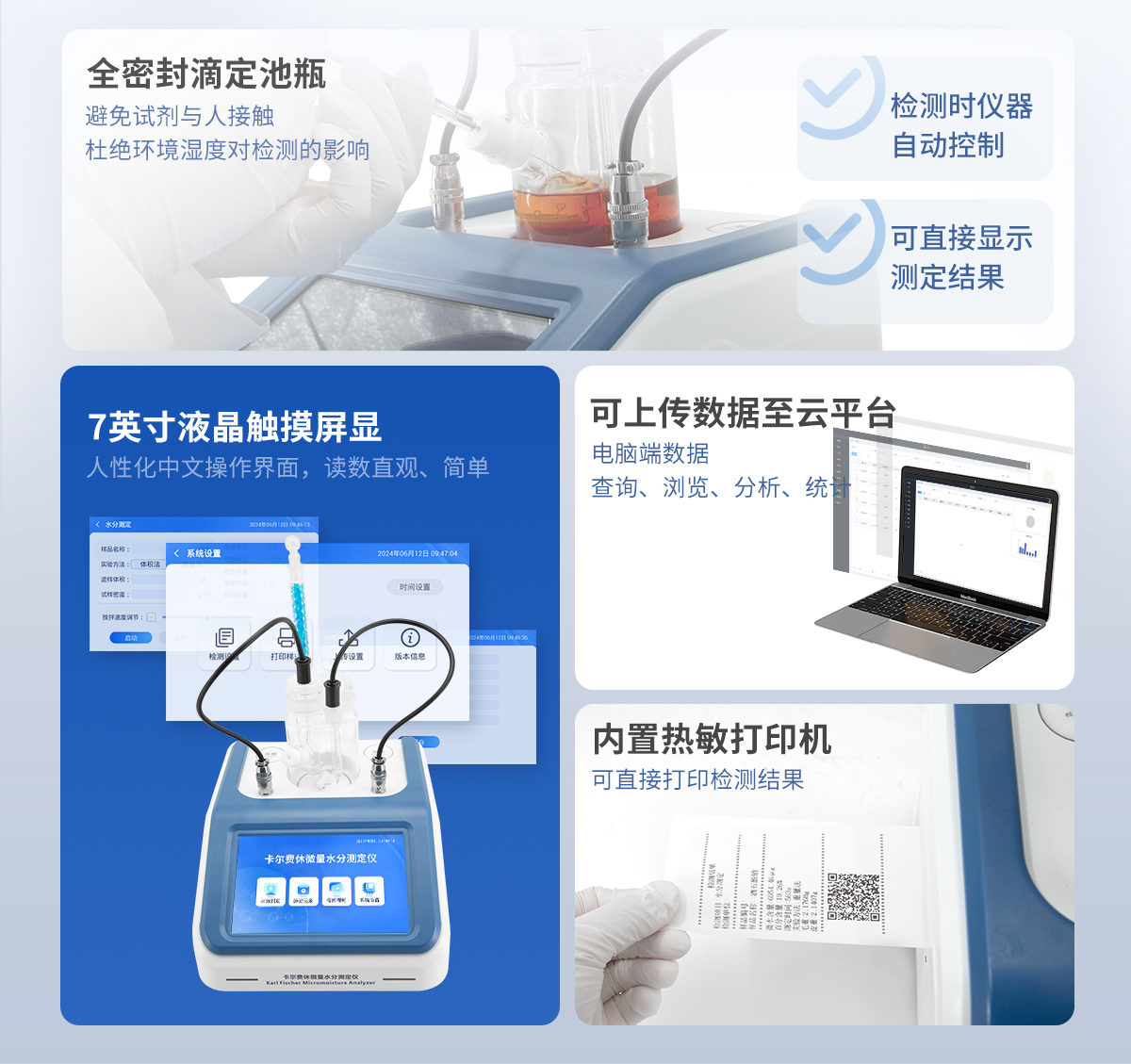 | 1.采用全新安卓系统,配置7英寸液晶触摸屏显示,人性化中文操作界面,读数直观、简单。 | 2.仪器主控芯片为ARM Cortex-A7,RK3288/4核处理器,主频1.88Ghz,运转速度更快速,稳定性更强显示方式: | 3.检测采用全密封滴定池瓶,避免试剂与人接触,杜绝环境湿度对检测的影响;检测过程中仪器自动控制,搅拌、测定60秒左右完成,可直接显示测定结果,无需人员频繁操作。 | 4.仪器内置操作视频,可直接观看学习操作方法。 | 5.仪器可以测试多种样品,循环检测,即放即检。 | 6.仪器可对样品信息自由编辑,包括:样品名称、样品编号、检测单位、检测人员、联系方式、受检单位等。 | 7.仪器可对检测样品测定信息进行设置,例如:电解电流、电解电压、微量水分含量、测定时间、百分含量、进样体积、试样密度、毛重和皮重等。 | 8.水分检测方式可根据实际需求选择体积法或重量法。 | 9.内置热敏打印机,可直接打印检测结果,并可根据需求灵活设置打印内容(二维码,样品编号、检测单位、检测人员、联系电话、受检单位、检测日期等)。 | 10.样品检测结果可通过二维码扫码查看。 | 11.检测数据可通过历史记录进行检索,通过设置检测日期、样品编号、检测单位、检测人员、样品名称、受检单位等信息查找对应数据。 | 12.仪器配备标准USB接口,免驱动安装。检测结果存储容量20万条以上,可生成Excel表格进行拷贝。 | 13.仪器配备WiFi通信模块,可上传数据至云平台,实现电脑端数据查询、浏览、分析、统计等。 | 14.仪器可定向远程更新,进行升级维护,无需返厂更新,节省时间及人力成本,避免了物流运输导致设备损坏的潜在风险。 |
