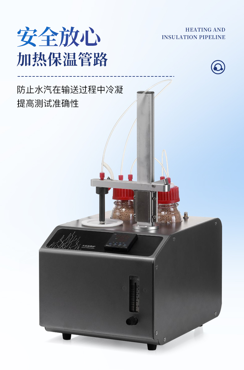 | 1、10ml样品瓶:使用四氟与硅胶复合垫片,高温条件下不会释放可能产生副反应的物质 | 2、双干燥瓶设计,有效降低气源中的水分干扰 | 3、加热保温管路,防止水汽在输送过程中冷凝,提高测试准确性 |