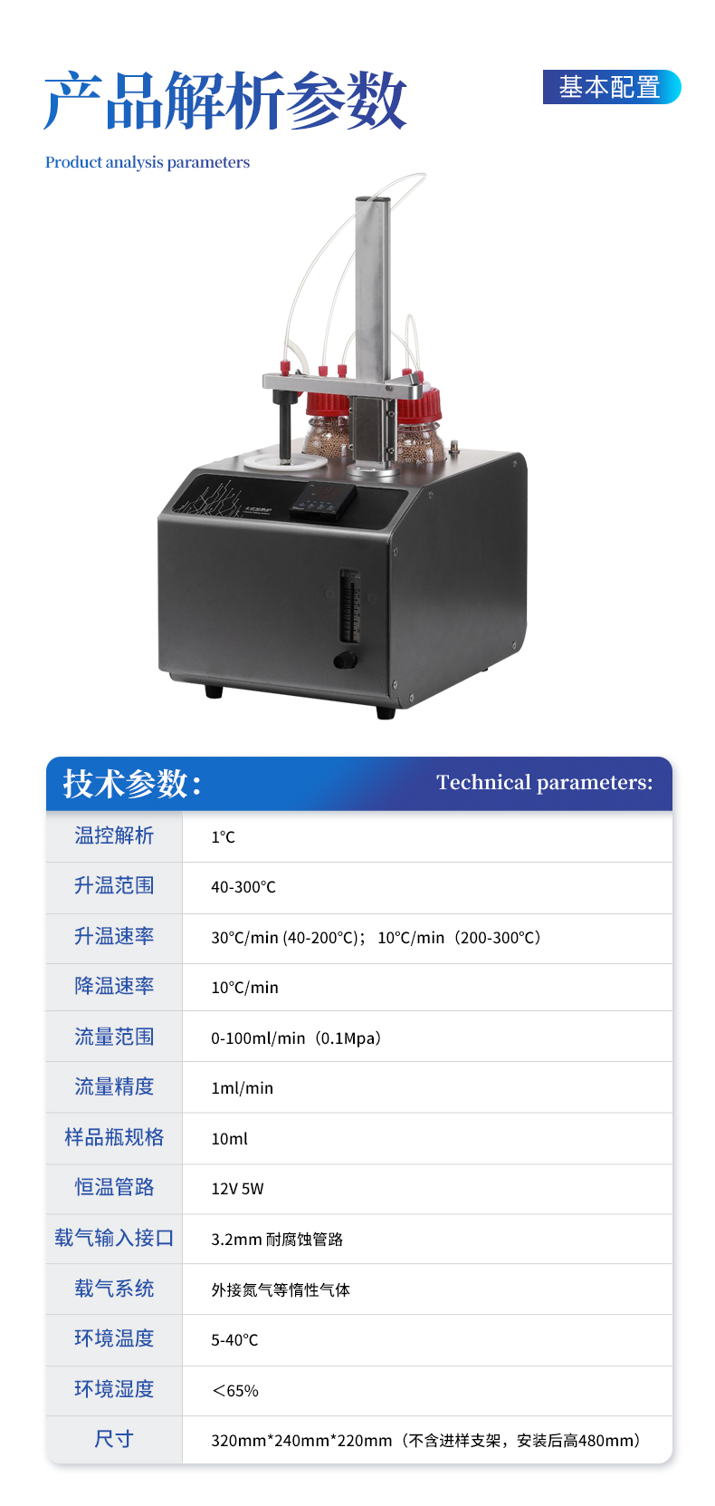| 型号:YT-KSL | 温控解析:1℃ | 升温范围:40-300℃ | 升温速率:30℃/min (40-200℃); 10℃/min(200-300℃) | 降温速率:10℃/min | 流量范围:0-100ml/min(0.1Mpa) | 流量精度:1ml/min | 样品瓶规格:10ml | 恒温管路:12V 5W | 载气输入接口:3.2mm 耐腐蚀管路 | 载气系统:外接氮气等惰性气体 | 环境温度:5-40℃ | 环境湿度:<65% | 尺寸:320mm*240mm*220mm(不含进样支架,安装后高480mm) |