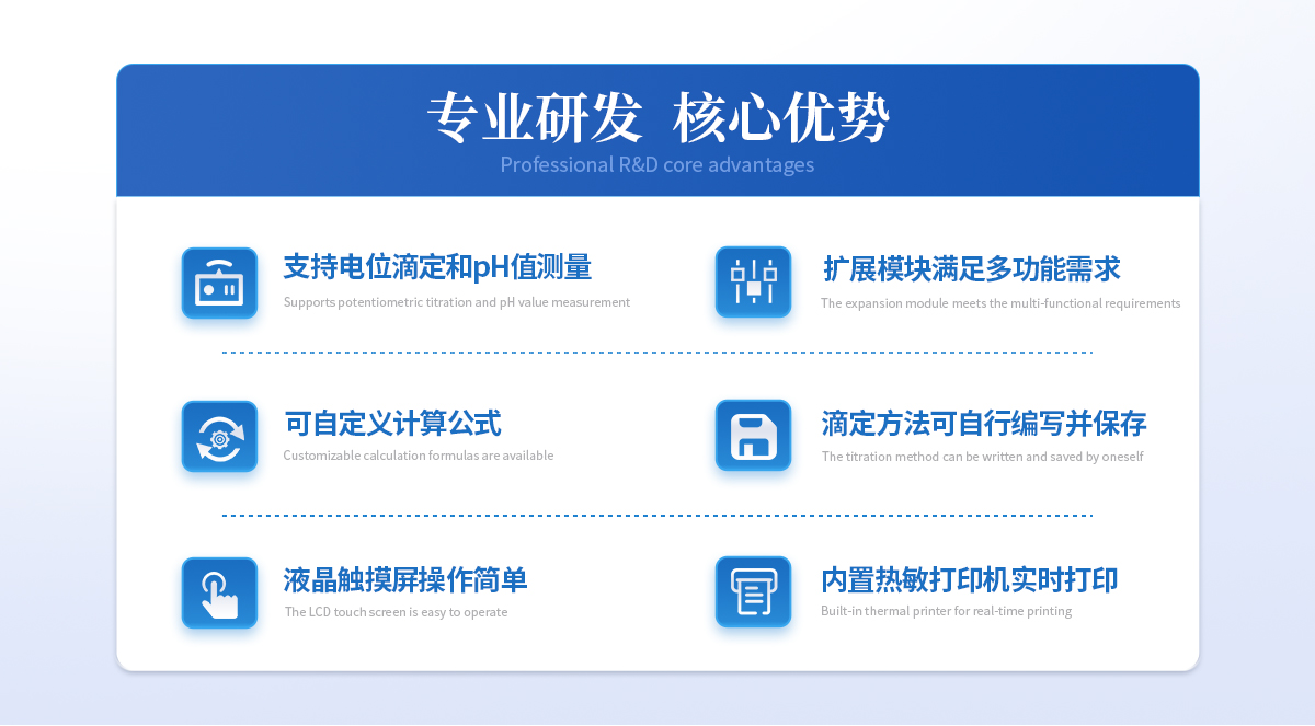 | 自动电位滴定仪是一种用于化学分析的精密仪器,他通过自动添加滴定剂来确定样品中特定成分的浓度。该仪器基于电位滴定原理工作,即根据在滴定过程中电池电动势的变化来确定滴定终点的一款滴定设备。设备满足国家检定规程JJG 814-2015《自动电位滴定仪》仪器级别中的0.05级别,即仪器**示值误差为±1.5%,仪器示值重复性≤0.2% |